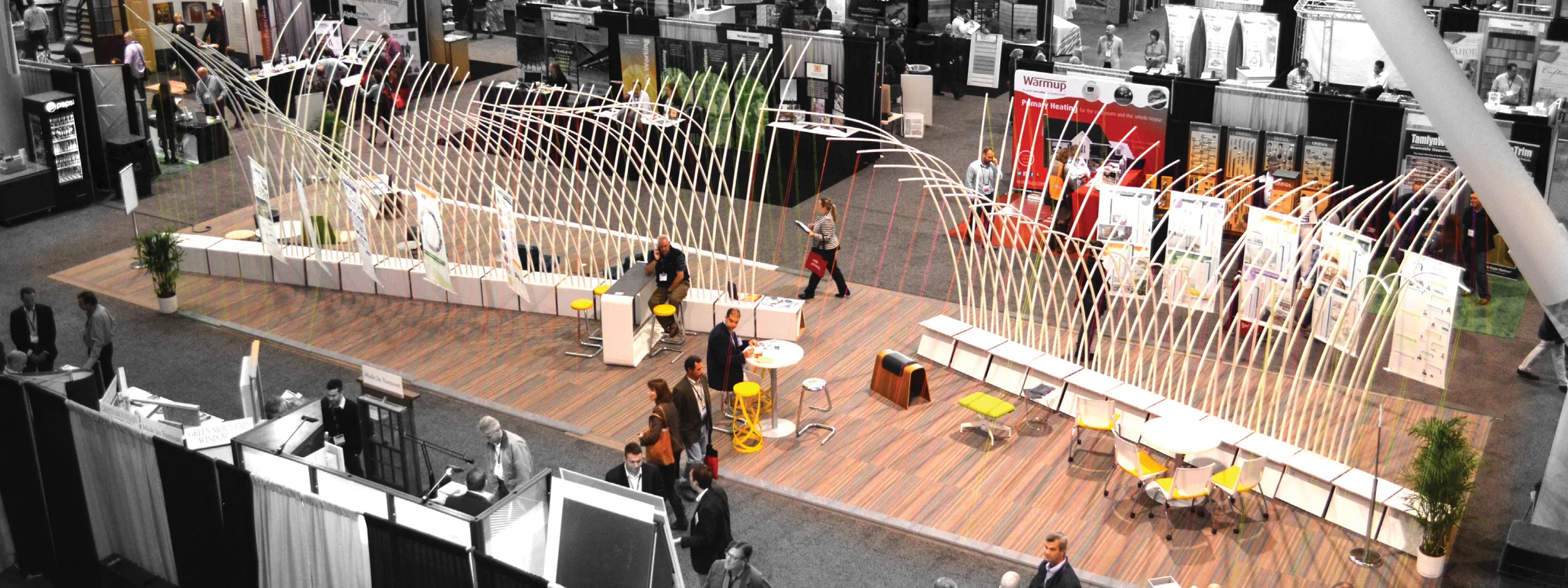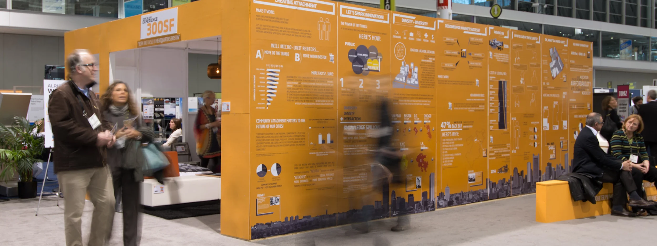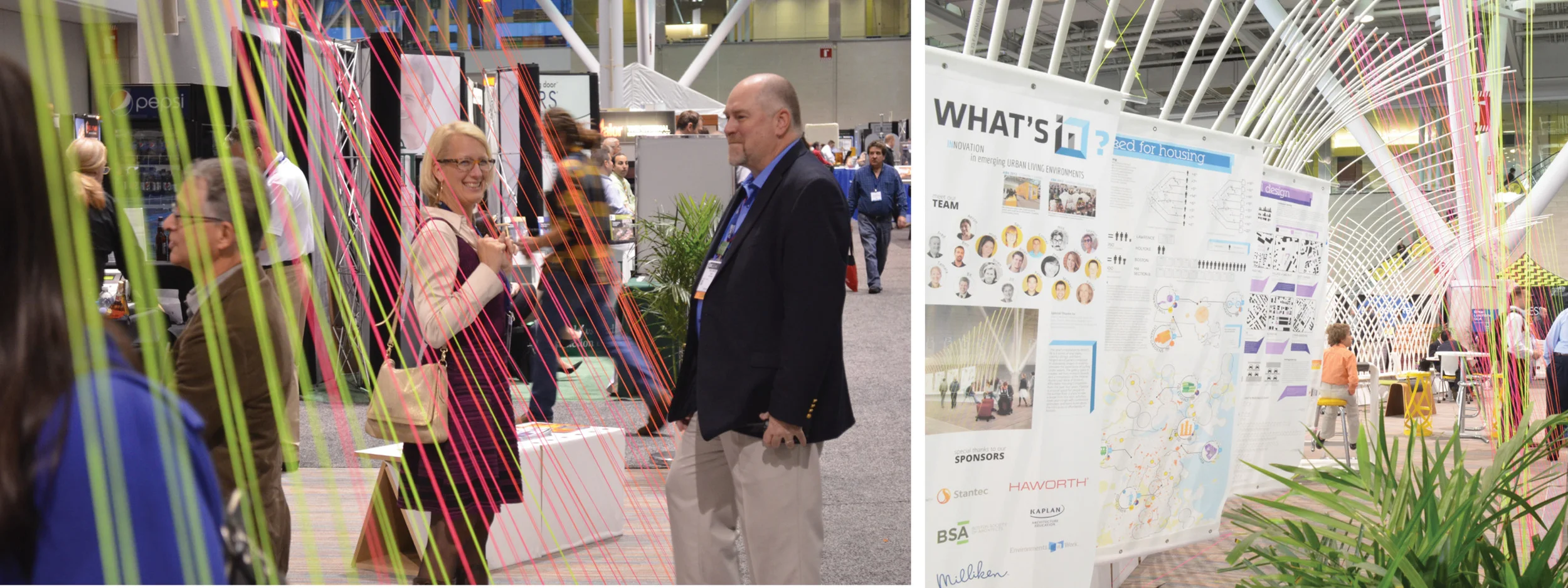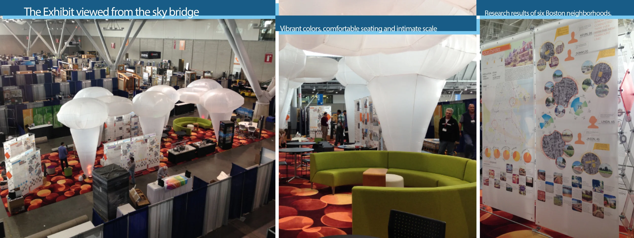 The ABX 2014 exhibit by WHAT’S IN, titled PipeLine, was designed to showcase our research findings. It was a series of vinyl pipes, colorful strings, and fabric hinged wood panels composed in undulating shapes in order to simulate the experience of surfing under waves. In addition to our research boards, it also included a compilation of the Bank’s Affordable Housing Competition from the past four years. Pipeline was a social space for people on the exhibit floor, a place to take a break from the day’s activities, meet and mingle with conference attendees and learn more about the intricacies of affordability in Boston.