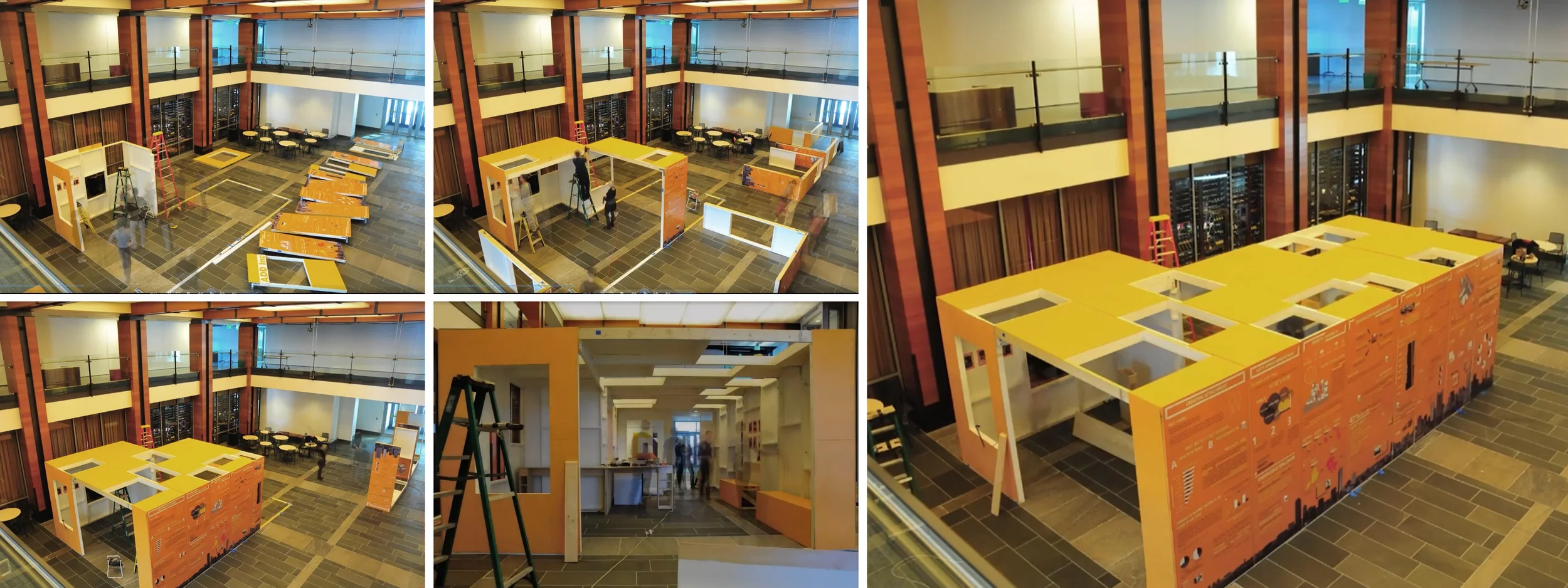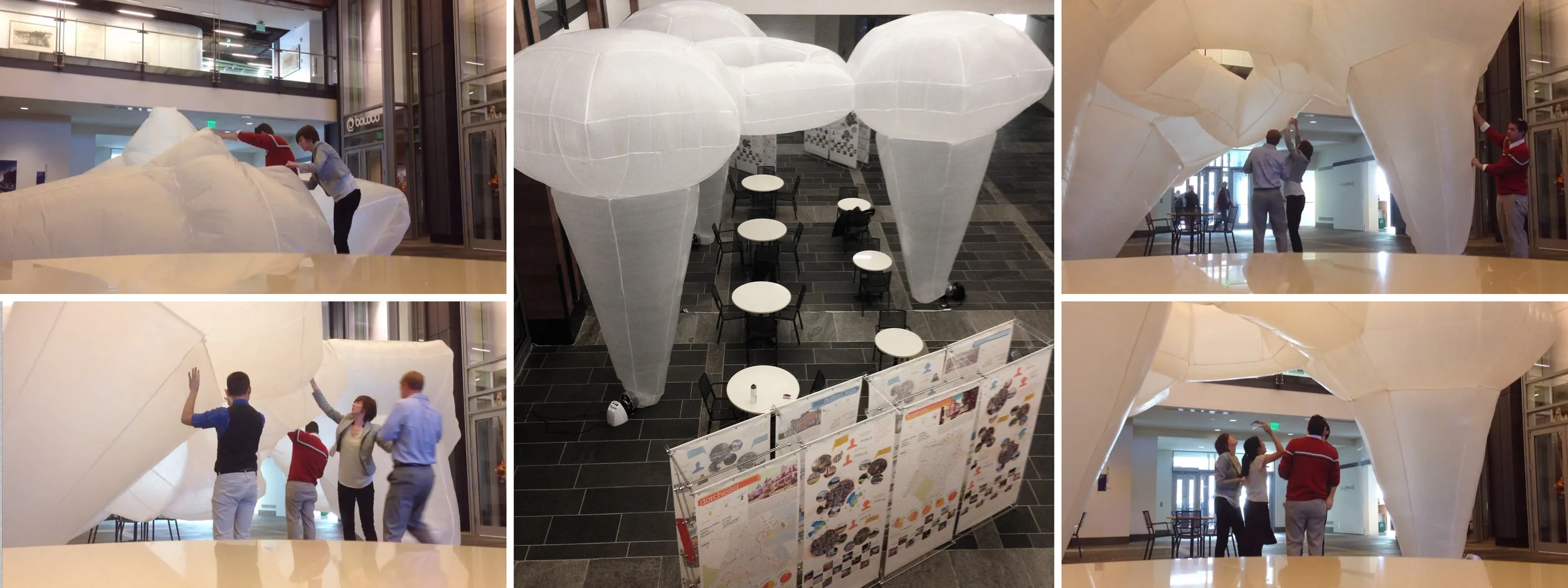 How to build a space that is flexible to arrange, portable, and affordable? The WHAT’S IN team was determined to solve this problem during the 2013 ABX. The answer was obvious: Inflatables! It is easy to store, easy to deploy, and light-weight enough to reconfigure different spaces. Working with an extremely limited budget, the team had to test multiple materials to find the most cost-efficient product. At $5 a sheet, plastic drop cloth became the fabric for the infallibles. It is easy to work with, and light enough so that it doesn’t weigh down the structure.